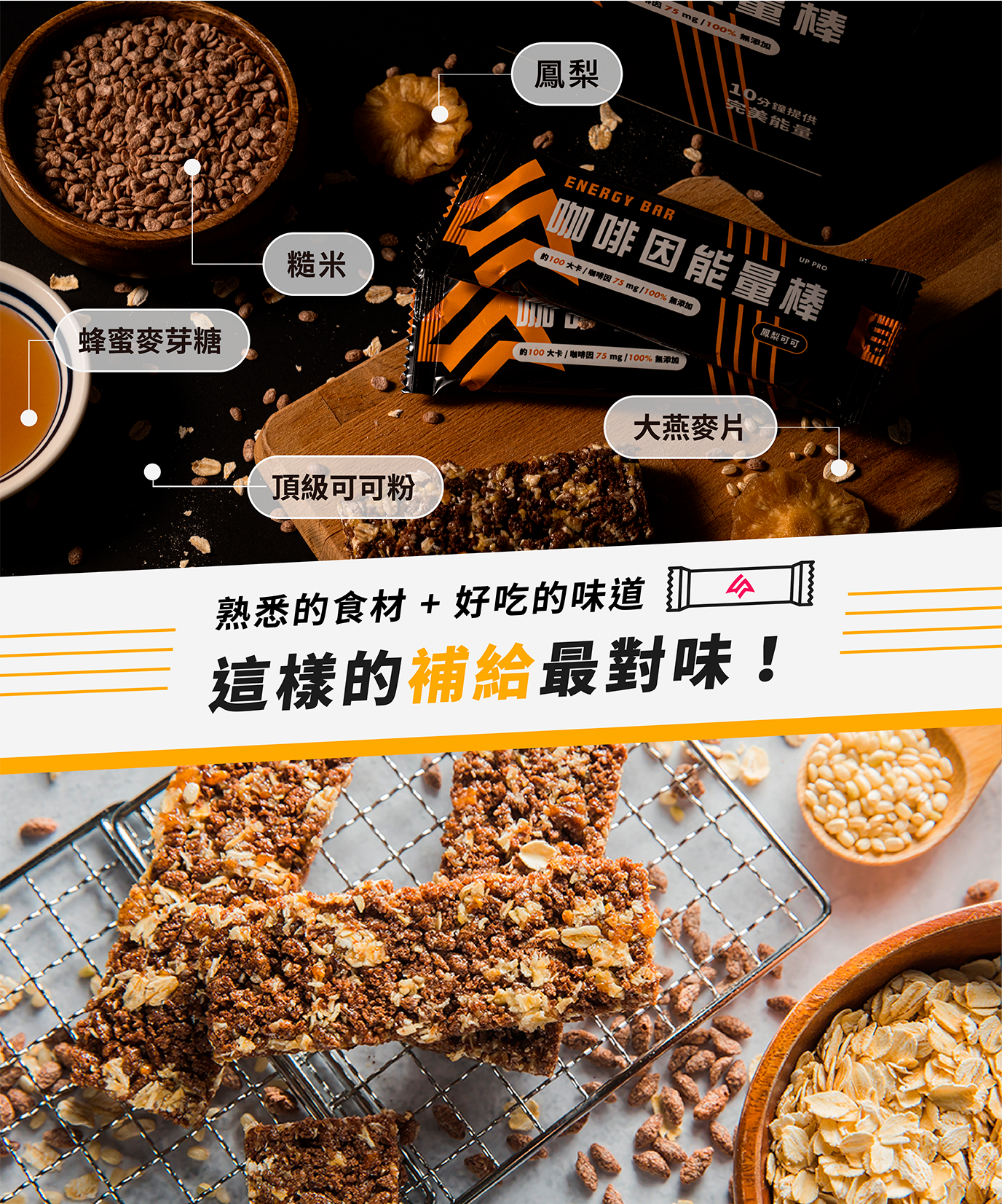 糙米、大燕麥片、台灣在地鳳梨乾、法國頂級可可粉、蜂蜜、麥芽糖製成