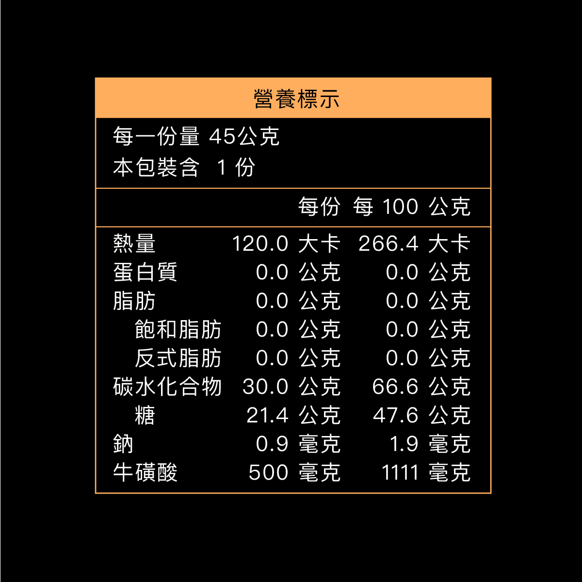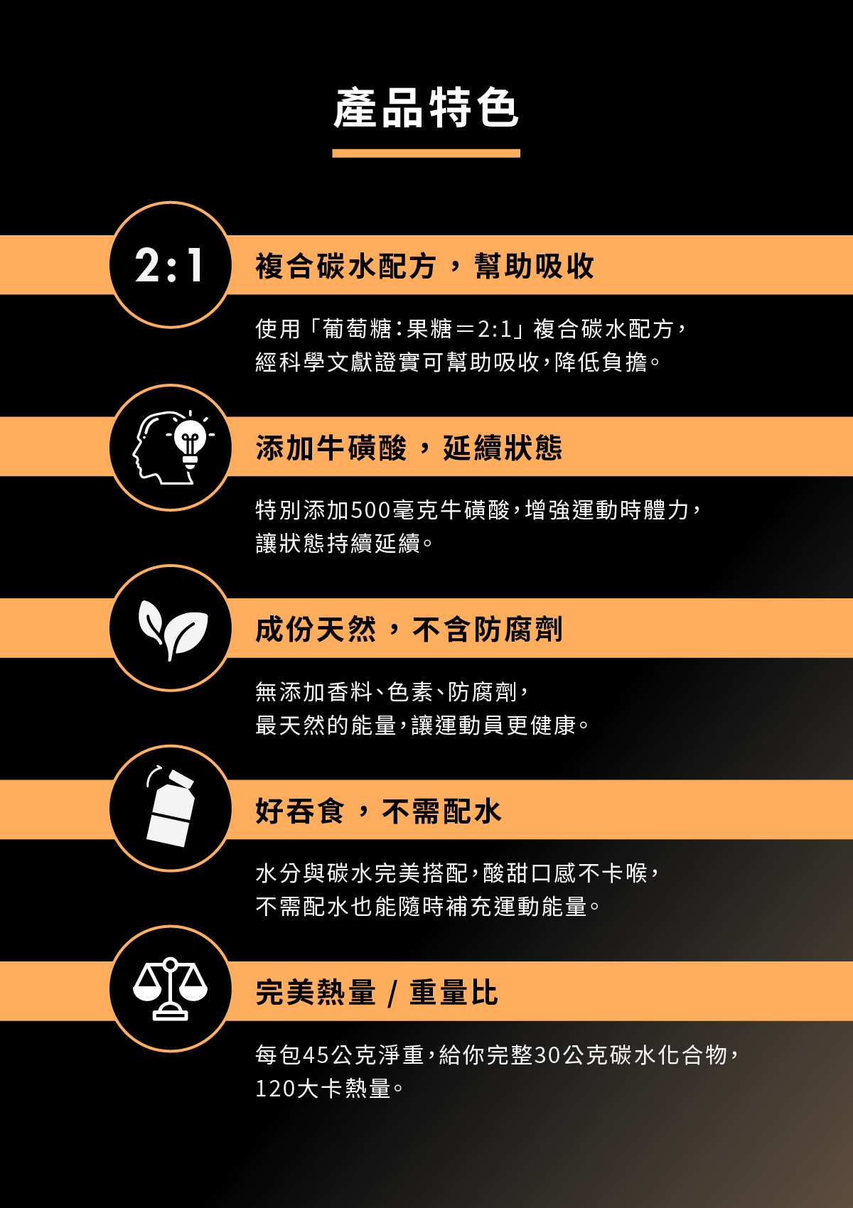 5. 完美熱量/重量比,每包45公克淨重,給你完整30公克碳水化合物,120大卡熱量